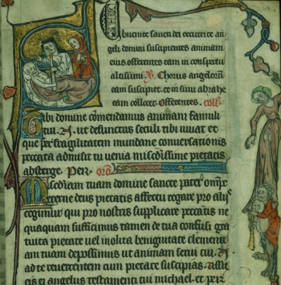 Manuscripts intended for private devotion were illuminated with both profane and religious images. The illustration, shown below, taken from a Psalter-Hours housed in The Walters Art Gallery demonstrates this. In the main miniature, the initial ‘S’, a dying man is receiving the last rites from an abbot. Juxtaposed to this emotional scene is a strange hybrid musician standing on what look like lions paws, playing the bagpipes whilst supporting a rather long dancing lady on his shoulders. The artist has not drawn part of her raised left arm. I wonder if, when drawing the dancer, he suddenly realized that the scribe had left insufficient space in the margin to complete the figure. Cropping, I presume, became the obvious solution. And those bagpipes are rather curious; under the musician’s face a second funny face protrudes. Notwithstanding that the dancer performs elegantly in her flowing dress, she and her partner have little more than a decorative function.