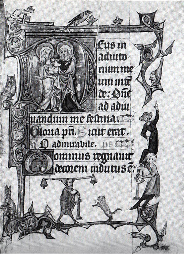 The dancer perched on the musician’s shoulder motif occur every so often in manuscripts produced in both the Low Countries and those made in Paris and the British Isles. Whether from the Low Countries or elsewhere these dancers and musicians are always placed on the outskirts of the page and they have very little or no direct relation to the written text. Take, for example, one of the earliest Flemish Book of Hours, the Ghistelles Hours, which was probably made for John III Ghistelles and his wife Margaret of Luxembourg around 1300. Even though I can only show you a black/white image, this folio clearly demonstrates that the great activity taking place all around the boarder has a limited relation with the biblical illumination of The Visitation which is shown in the historiated initial ‘D’. I use the word ‘limited’ because the rabbit on the lower left might be a suggestion of fertility and the owl on the outer ridge next to the main illumination would most likely suggest wisdom. But the meaning behind the dancer and musician is far more puzzling. Here we have Saint Maria and Saint Elizabeth meeting each other at a most profound moment in their lives only to be surrounded by musician playing a long trumpet and an agile dancer whose main interest is directed towards a musical fool and the sprightly cat. Dancer and musician appear totally oblivious of the exceptional event taking place. Only the wise owl, seated on the same level as the miniature, appears to be aware that he is present at a miraculous event.