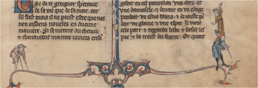 Centre & Right – British Library – Lancelt Grail Prose Cycle – Royal 14E III fol 3 – possibly St. Omar or Tournai – early 14th century