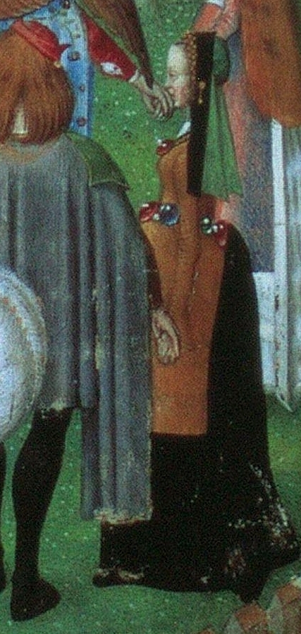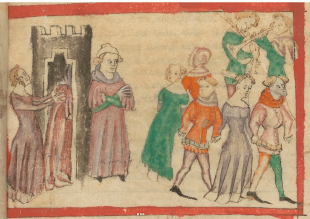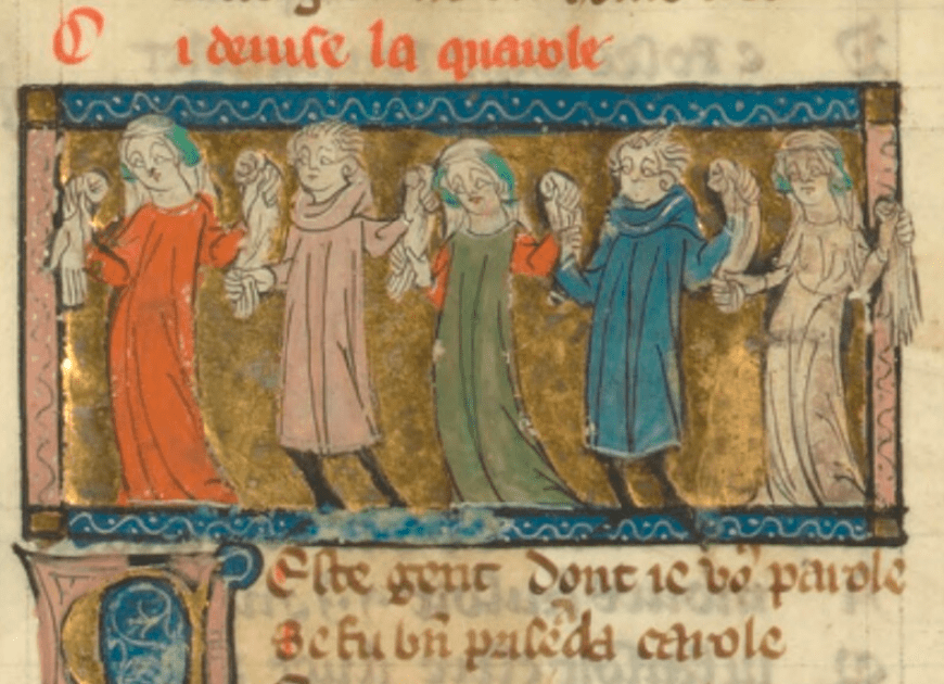 The Morgan Library and Museum houses an intriguing manuscript possibly made in Tournai (present day Belgium), around 1390. The miniature, named Carol of the God of Love is found halfway down the page and expands over two columns. Set outside against a gold background Amour (easily recognized by his huge wings) dances a line dance with four men and women, including a queen. On either side of the line, two young people hold hands, facing each other, but neither the two maidens, nor the two boys appear to move with any vivacity. This carole is a slow, eloquent dance, accomplished with courtly dignity.
