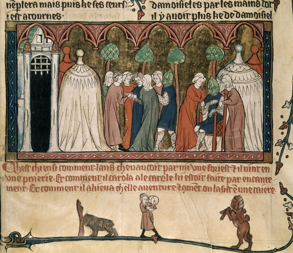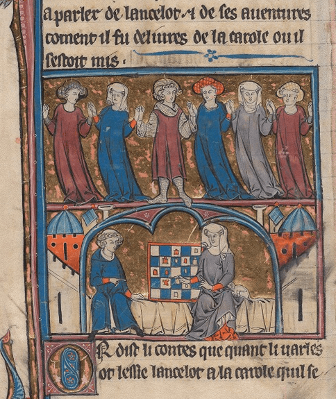 In Le Roman de la Rose, the carole is danced by the lover and a group of allegorical figures in the Garden of Love. In Prose Lancelot the carole takes place in an enchanted forest. In this mysterious woodland, ladies, having been placed under a spell, dance a never-ending carole, waiting to be released by ‘the best knight in the world’. This carole, a circular dance, has neither a beginning nor an end; the dancers travel to nowhere, seemingly suspended beyond the natural flow of time. When Lancelot and his men arrive in the enchanted forest, they see the ladies dancing a carole near an ivory throne bearing a large gold crown. Lancelot, having never committed an offense against love and being the best knight alive, enters into the dancing. He is found to be the rightful bearer of the crown. The spell is broken. And furthermore, being the best knight alive, Lancelot is also able to defeat the magical chessboard with its annoying habit of moving pieces on its own accord.