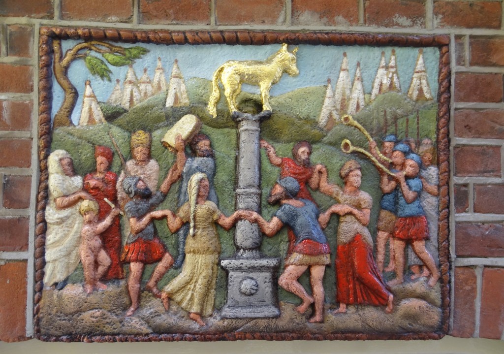 Before moving onto panel painting, I would like to draw your attention to a unique representation of the Dance around the Golden Calf in the late Gothic church of Saint Ursula in Warmenhuizen, a town not far from the famous cheese producing town of Alkmaar. The North Nederland’s artist, Jacob van Oostsanen (1470-1533), is attributed as master of the magnificent vault paintings in the choir, showing four scenes from the Old Testament, including the golden calf and the Last Judgment. Israelites, men, women and children dance stylishly around the golden calf and Moses is shown at that most decisive moment, just before he smashes the tablets. Similar to the gable stone, the tents of the Israelites form the background landscape. And to complete the narrative van Oostsanen has added two figures at the top of the mountain, next to the rib; God can be seen handing Tablets of Law to Moses.