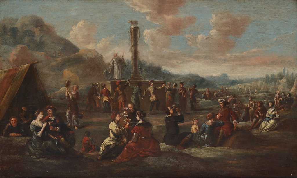 If van Mander invited self-reflection, the following painting by Anthonie Palamedesz (Delft 1601-1673) is without doubt social criticism. Palamedesz, a prolific artist specialized in elegant companies and portraits. A biblical narrative, as shown below, is unique in his oeuvre. All the elements of the Exodus story are present, including not one, but two dance sections. The first, the dance around the calf, immediately catches your eye. These Israelities, now dressed in shabby clothes, pray, kneel and raise their arms in adoration whilst cavorting around the idol. And between the trees, groups of people are frolicking, hopping and skipping around crunched figures. But the subject matter is not the dancing; rather the issue is to scrutinize the over indulgent individuals resting languidly in front of the trees. Like van Leyden and van Mander, Palamedesz has situated a pompously clad woman, nurturing a child, in the foreground. Her discouraging glance is focused straight at us. Behind her stands an old shrew, displaying erotic symbols, complete with a distinct feather in her cap. Feathers, decorative as they are, are also indication of absence of chastity. And then there is the drinking, the gluttony and the squandering. In Palamedsz’s hands, the dance is merely a prop to expose the excesses of a forlorn society.