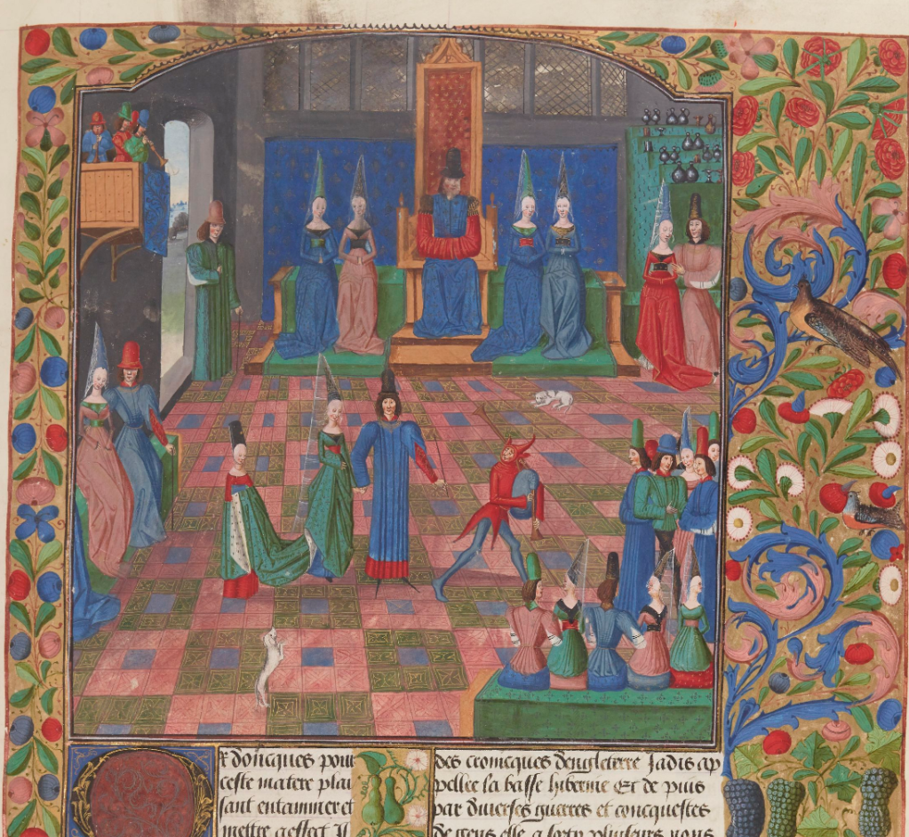 At the Burgundian Court the fashionable basse danse was enjoyed by the aristocracy and the well-to-do. A unique, late 15th century manuscript, Les Basses Danses de Marguerite d’Autriche, once belonging to Marguerite d’Autriche, daughter of Marie of Burgundy, notates fifty-eight different variations of the basse-danse together with their accompanying musical score. This exceptional manuscript, one of the earliest known dance manuals, indicates the significant status dance held at the Burgundian Court. In this post, I will discuss images of the basse-danse that appeared in diverse manuscripts created in this illustrious environment.