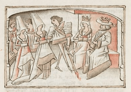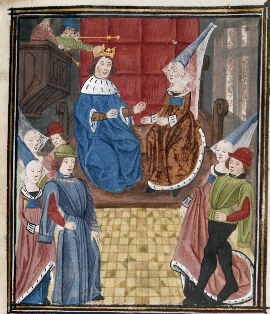 The left illumination, shown above, is a small column miniature taken from a medieval reproduction of the popular Latin manuscript Facta et dicta memorabilia, a series of books written by Valerius Maximus (Valère Maxime) during the reign of the Roman emperor Tiberius. Valerius Maximus discusses morals, vice, virtue, merit, superstition and various other subjects. The above miniature is the work of the Master of Margaret of York who was active in Bruges between 1470 and 1480. The illumination on the right is a small detail taken from the illustration placed at the top of this post; Jean Wavrin’s Chronique d’Angleterre is attributed to Master Anton of Burgundy.