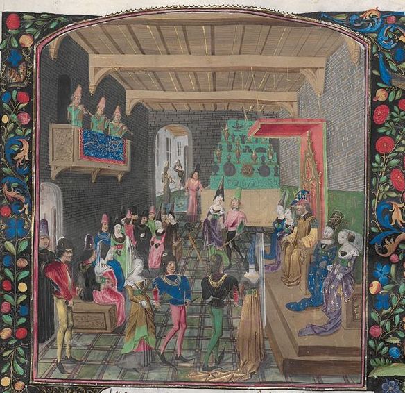 In comparison, the above illumination, of the betrothal celebrations of the daughters of King Diodicias, on the opening page of the romance Guiron le Courtois, is not at all stilted. Each couple is unique and the figures are positioned casually around the dance floor. These couples walk leisurely side by side, turn freely towards each other, have a greater movement possibility yet retain their regal composure. The men, without the unpractical poulaines, are no longer limited in their movement and the ladies, though still wearing heavy gowns, are less inhibited by their headdress than their counterparts in the previous images. The artist, the Master of Edward IV (active 1470-1499) is known to dress his figures in different costumes, to use a variety of headdresses and to accent a lady’s cheek with a touch of rouge. All these factors make the dance scene appear less ceremonious, so much so, that the processional characteristic of the basse-danse is no longer prominent. Identifying a specific dance form depicted in a miniature or painting can be challenging. But, in this example, it is feasible to assume that these elegantly poised couples are performing the basse-danse.