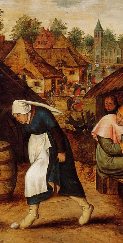 A kissing couple, a monk fondling a tankard, a musician playing a vedel, a woman with a pot on her head, a kermesse and church procession all form the decor for Pieter Brueghel the Younger’s portrayal of an egg dancer. The Egg Dancer, from around 1620, shows, contrary to many other images of an egg dance, an old, stooped peasant woman, attempting to nudge an egg into the bowl. Where all the previous egg dancers were young, swift, athletic or energetic men jumping or hopping around on one leg, their hands placed firmly on the waist, this old woman in flabby footwear, hitches up her long cumbersome skirt and looks thoroughly exhausted as she earnestly continues her dance. Hopping and jumping are out of the question, but, just how is she to get the egg into the bowl? Since both feet are on the ground I can only imagine a type of shuffling step where she moves the front foot forward, displacing the egg, followed by the back foot quickly trailing in. A difficult feat; all the more since the plodding peasant is not even looking at the egg, but at a spot just past the bowl.