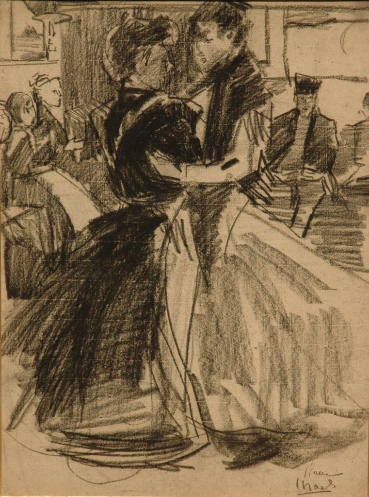 Midway the 1880s when van Gogh moved to Antwerp, the dance hall was very popular. There, the lower classes enjoyed their sparse free time drinking and dancing. The sphere was, no doubt, vivacious, inspiring van Gogh’s two sketches. Isaac Israels, as Breitner, was known to frequent bars, dance halls and cabarets in search of recreation, inspiration and innovation. There, with pen and paper in hand, Isaac Israels sketched the lower classes; maids, laundresses, seamstresses and other working folk enjoying themselves. Breitner, on the other hand, was one of the first artists to photograph his subjects, using the photos as reference material for his paintings. It could not have escaped your notice that van Gogh, Israels and to a slightly lesser extent Breitner, render dance, in a strikingly similar fashion. Take the three examples shown below; each show two working girls dancing, holding each other closely, with a few people in the background. To my mind, van Gogh has most successfully portrayed the actual sensation of movement. Israels can convince me that women are swirling, but Breitner’s women are more passive, more occupied with each other. However, even though the nuances may be different the similarity remains obvious. In fact, the question arises if the artists were inspired by each other’s work, or, if they just happened to be present at the similar establishments and see the same type of dancing.
