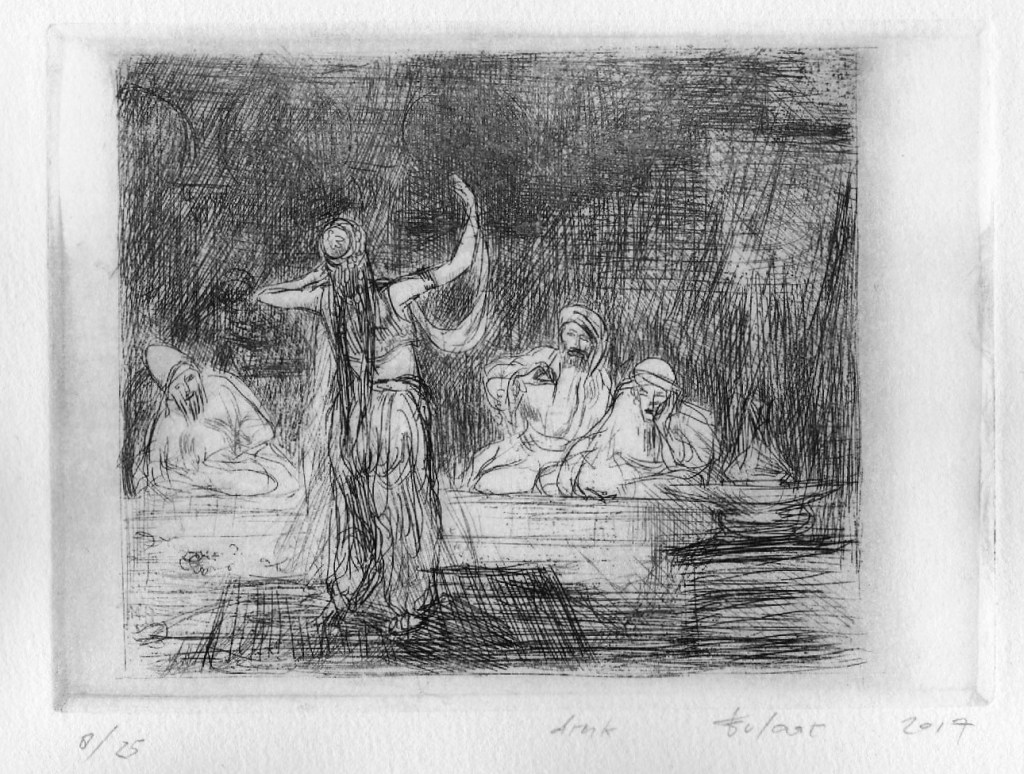 Belly dancing conjures up visions of films, nightclubs and tourist shows, where dancers, barely clad, roll their hips, making sensuous undulations of the upper body whilst meandering suggestively around a spacious stage. Testas portrayed a very different dancer. Suggestive, most certainly, but this dancer, even though she is an entertainer, performs a more traditional dance. She moves within a limited space. Her dance is quite stationary; she can make a few small steps to all directions and turn around her axis. This dancer, accompanied by a number of musicians, has discarded her shoes. Her décolleté plunges down between her breasts, but her legs are enclosed by a floor-length decorative shirt. The emphasis of her dancing, so unlike the contemporary French can-can where dancers show their legs blatantly and throw them high into the air, is entirely on the pelvis and torso. With eyes cast down, this bejewelled dancer, propels her pelvis, twists and turns her hips and torso, moves her arms fluidly whilst accompanying herself with the clatter of castanets. As she dances the chimes hanging from her belt ring, accompanying the jingling sound of her necklace, her scarf and even her hair; all of which are draped with coins or other metallic pieces.
