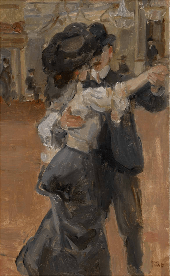 In most paintings of the Moulin de la Galette whether by Renoir, Toulouse-Lautrec, Picasso or Kees van Dongen, the dance hall is always crowded, crammed with dancing, drinking and chattering merrymakers. Isaac Israels paints a different picture. The above images, give a more personal scene, describing two people dancing affectionately. The large dance hall is practically empty. A few guests are walking down the stairs and others are seated on a bench. Israels has painted the dancers from the same angle, placing both scenes in a similar, if not the identical setting; in both paintings there are chandeliers, stairs (not visible in the right painting) and columns. The left image presents a young woman dancing with a military man; possibly there is another couple dancing behind them. The right image illustrates, I presume, a somewhat older couple, but this is not easy to see since both faces are concealed. The younger couple is situated in the absolute centre of the canvas, portrayed from head to foot. There are no musicians to be seen, but looking at the woman’s swinging skirt and her swift footwork, they are most probably dancing a lively fashionable dance. The military man holds his partner just tight enough to facilitate the lively dance movements. This is a fun-loving pair, enjoying themselves. The right couple appears to be the only couple on the dance floor. Even the other guests seem oblivious of their presence. The gentleman holds his partner tenderly; his arm placed well over her back. They are deeply involved with each other. Israels gives no indication as to how they are dancing having cropped their feet entirely. In both these paintings, Israels, pays particular attention to the background, the body language and the couple’s physical interaction. He sympathetically illustrates human emotions of everyday people in common situations.