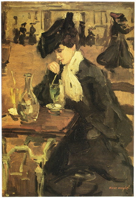 Le Moulin de la Galette, besides being a popular dance hall, was famous for its galettes, a delicious bread brown, often served with wine. All women, even those with somewhat looser morals, had a free entry. Around the dance floor there was ample space to sit, eat and drink. Israels painted a series of canvases showing a man and woman seated at a wooden table, with people dancing in the background. Nowhere is the Moulin de la Galette ever crowded, nor light-hearted or exuberant as in the works of Renoir or Kees van Dongen. The sphere is muted; Israels predominately uses black and various shades of browns supplemented with an occasional red hat, a white scarf or a sombre blue dress, and even those colours are subdued. The image, shown above, is painted from a high vantage point; Israels was probably originally sketching from the balustrade. He zooms in on a couple, seated at the edge of the dance floor. They are well-dressed, as all the guests present. The man smokes a cigarette. He has a glass of wine in front of him, his lady friend, judging from the green liquid, a glass of absinthe. You will recall that absinthe has a high alcoholic percentage and once thought to be a hallucinogen.