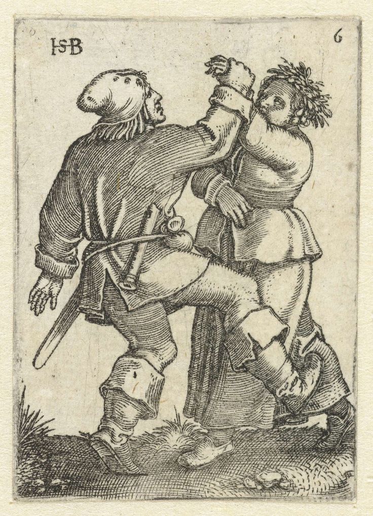 Treat yourself to a panorama view of a village fair; if you take a moment to expand the image of Village Fair (Large Kermis) Sebald Bedam’s exceptional woodcut will astound you. From our high vantage point we are witness to a wedding procession, a merchant selling his ware, barrels of beer, a dentist about to extract a tooth, and a couple kissing in the doorway of the tavern. And in the very centre of the woodcut there is a vomiting man; a dog, just as in Peasant Feast, helps to tidy up the mess. The narrative continues on the right side with fighting men, horses galloping, someone climbing up the maypole, and important to this post, a group of dancing peasants. Two musicians, a bagpiper, and a fellow playing the shawm, lean against the tree. Each dancing couple, now depicted in more considerable detail than in Peasant Feast, have a distinctive shape. Some dance side by side, another is in the process of turning, others are skipping or hopping forward, and the most unusual, one of the girls is being lifted into the air. She, unlike the other women, does not wear a cap, but a tiara of flowers. Is she a bride? Are these dancers celebrating the wedding taking place in the church scene?
