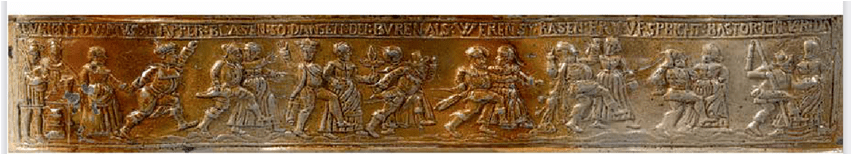 The following merry festive scene is the left section, the dance section, of a larger woodcut by the miniaturist and engraver Sebald Beham. As in the Kermis at Mögeldorf frieze the peasants are revelling, drinking, and dancing. One of the revellers is seen vomiting in the foreground; excessive drinking no doubt being the cause. The dancers are arranged in a semi-circular pattern, accompanied by the typical peasant musicians, a shawm, and bagpipe player. Each couple assumes a characteristic pose. The couple, centre front, prance forward with uplifted arms, another couple faces each other in near embrace, and moving along the circle there is a couple turned back to back. Their arms reach decidedly outwards and upwards. This distinctive pose not only echo Dürer’s famous engraving, but will, a few decades later, appear in the work of Bruegel and his contemporaries.