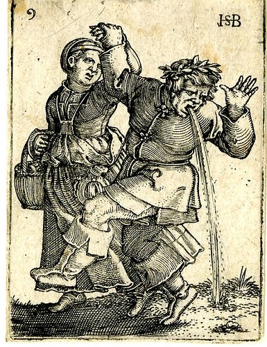And then there is the drinking jug! Peasants who enjoyed drinking large quantities of ale were never lacking at weddings, festivals, or at the annual kermis. Jugs were the ideal vessel. Many of these stoneware jugs were produced in Raeren, a small town not far from Liège, famed for its pottery production. These beautifully decorated jugs, a type of 16th century tubberware, were immensely popular in The Low Countries. The jugs were frequently embellished with the peasant dancing images we have come to know from Sebald Beham. The familiar couples hopped, turned, and capered. Even the puking man makes an appearance.