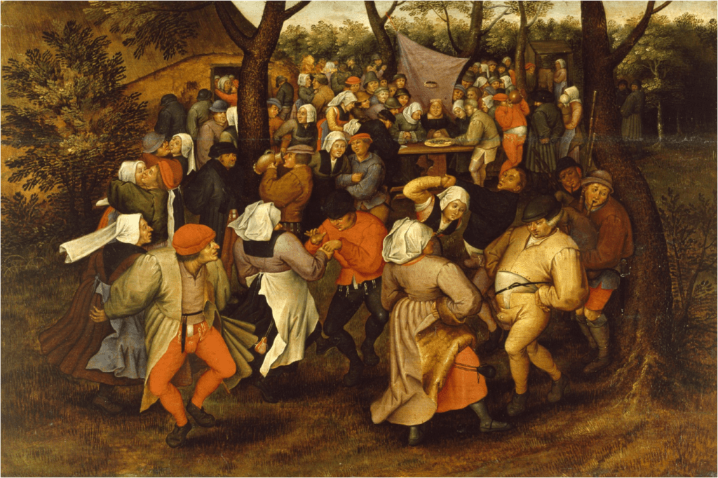 Pieter Bruegel the Elder was by no means the first artist to paint peasant life, but where earlier artists turned to a bird’s eye perspective, filling the canvas with a multitude of miniature figures, Bruegel placed the peasant prominently in the foreground. He, as no other, revolutionized the manner of portraying peasant life and peasant dancers. This post will focus primarily on Bruegel’s dancing figures. In the first instance I will concentrate on The Wedding Dance housed at Detroit Institute of Arts which, according to most experts, is the original Pieter Bruegel the Elder work. I must mention that there are reproductions and different versions of The Wedding Dance. Images found on the internet or elsewhere may be the work of Pieter Brueghel the Younger or an array of different artists.