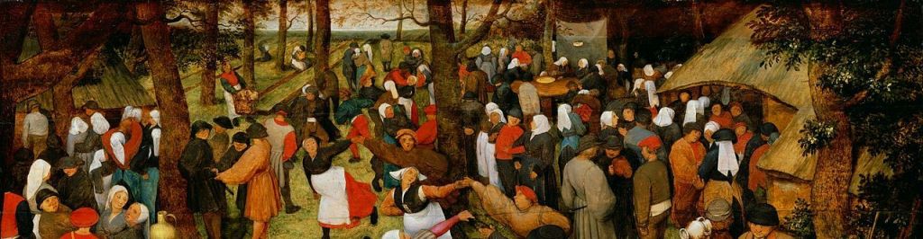 Bruegel’s Wedding Dance is original, innovative, and groundbreaking. That is not to say that peasants and peasant dancing had not appeared in earlier art works. Peasants were infrequently seen as drolleries, marginal figures decorating illuminated manuscripts. In German art, peasants, often of gross and uncouth character, appeared on prints. And not to forget the acclaimed Dutch artist, Hieronymus Bosch, whose enigmatic paintings contained isolated peasant scenes. Dancing peasants appear in a number of his works; possibly the best known is the dancing couple on the outer shutters of The Haywain. In all the examples mentioned, with the exception of Albrecht Dürer‘s prints, the dancing peasant is but a minor element of the narrative. Invariably, the rustic is a background figure, frequently employed as a metaphor inferring a moral or didactic concept. Bruegel placed the (dancing) peasant at the centre of attention; he became the key subject of the artwork. The Wedding Dance, painted around 1566, is all about peasant life, highlighting the day-to-day existence of the peasant as they dance, talk, drink, and amuse themselves, celebrating a country wedding.