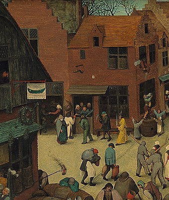 To the left of the bulky Carnival figure, who just happens to be sitting on a wine barrel, stands the local tavern. Shrovetide, the feast depicted, was celebrated with excessive drinking. One besotted fellow is slumped over a wine barrel, and another, a bagpiper in the upper floor window, is in the act of vomiting. And that drinking can lead to unexpected complications is the theme of the comic folk play, The Wedding of Mospus and Nisa (The Dirty Bride), that is presented in front of the tavern. Having had far too much to drink, Mopsus marries, to his own consternation, Nisa, a tattered, unkempt lass. We see the ill-suited newlyweds dancing in front of their shabby nuptial tent, accompanied by a musician playing on an improvised instrument. Moving farther back, a procession of lepers comes into view, a character dressed as a wild man enacts a play, a group of men and women perform a circle dance and behind them villagers enjoy a bustling bonfire. All this fun, drinking, lovemaking, and theatricals is juxtaposed against the right side of the painting, presided over by the old hag Lent. She, like her entourage, has an ash cross of Ash Wednesday on her forehead. Poverty, hardship, ailments and restraint are highlighted. The imposing church, adorned with a rose window, dominates the scene where a woman sells votive offerings, whilst the wealthy offer alms to the poor and needy.