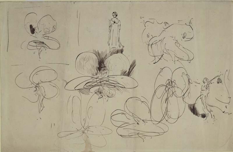 From her earliest performances at the Folies Bergère and throughout her career Fuller, the darling of the Art Nouveau, unceasingly inspired writers, poets, sculptors, visual artists, jewellery designers and photographers. The cylindrical advertising columns, so characteristic in the Parisian streets, were adorned with riveting, multicoloured posters of La Loïe, by Jules Chéret, Pal, and Toulouse-Lautrec. Renowned sculptors, among them, Raoul Larche, François Rupert, Pierre Roche, and Théodore Riviere created statutes, lamps, vases and other objects d’arts highlighting Fuller enclosed in gracefully flowing drapery. The great Rodin fell under her spell, and she captivated the acclaimed American artist, James Whistler, as the above pen and black ink drawing lovingly conveys.