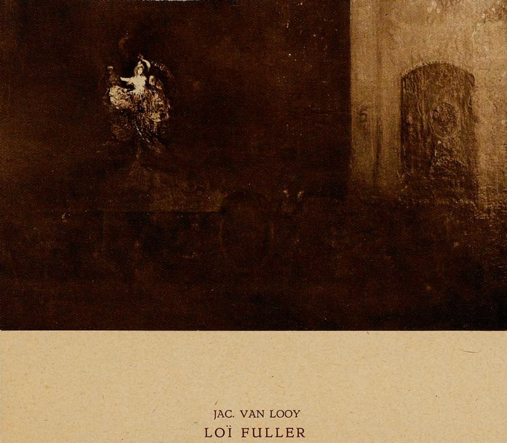 Loïe Fuller and her company travelled extensively throughout Europe and America. She visited Belgium various times but, as far as I could discover, rarely visited The Netherlands. This may explain why, though she inspired a myriad of international artists, I could only find a handful of works by Dutch and Belgian artists. In her autobiography Fifteen Years of a Dancer’s Life (f.p. 1908) Fuller recounts a ‘in every way a very successful’ gala evening in The Hague, where she was asked to perform before the Grand Duke and Duchess of Mecklenburg. A chronological overview of Alphons Diepenbrock’s life and work informs us that the esteemed composer, accompanied by his wife and other family members, attended a performance featuring Loïe Fuller in March 1898. The show took place in The Netherlands, but the venue is not stipulated. Where the artist/author Jacobus van Looij saw Loïe Fuller dance is unknown; perhaps in Amsterdam, but just as likely in Paris. Van Looij, about whom I wrote in two earlier posts,* was an avid traveller, painting various dance-related works. The image, illustrated below, is a black and white photograph depicting one of the sparse Dutch paintings, regrettably destroyed in 1945, celebrating Loïe Fuller.