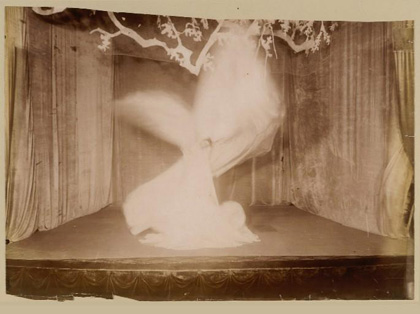 I mentioned that this artwork, though seemingly non-corporeal, is nevertheless representational. Contradictory as this may sound, the following photograph will clarify my point. Permit me first to explain that, except for three images, all the published photographs of Fuller were posed either in a studio or outdoors. The photograph, presented below, is a unique image taken during a live performance at the Thèâtre de l’Athénée in Paris in 1901 by an anonymous photographer. The image offers an authentic glimpse of the genuine Fuller as she contrives swirling spatial shapes that weave and glide on a stage overflowing with eloquent light. I must point out that during the actual performance, the stage would have been dark; the photographer needed to adjust his lighting to capture this thrilling moment.