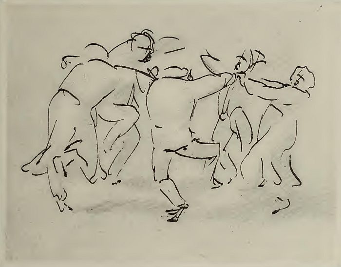 With little more than a few fleeting lines, Adriaen Brouwer sketches a jovial group of dancers scampering in a circle. Brouwer makes it quite obvious that these are rough peasant dancers. He emphasises their downward posture, their unpolished leg positions, and their hefty movements. Brouwer, renowned for his innovative genre works, composed small works of peasants invariably set in a wretched tavern or at a local fair. He drew and painted the sordid, vulgar aspects of life. He illustrated the dissolute, the rowdy, and the ribaldry of the common people. His portraits of intoxicated, uncouth, and gawky figures, despite the realism, verge on the caricatural. His models enjoy bizarre expressions. The grimaces range from comical to outlandish and dramatic. This exaggerated effect was achieved by a bold brushstroke, accented with a specific use of light and dark. Brouwer was known for his dimly lit scenes, leaving one side of the canvas in virtual darkness. His ‘rough’ style highlighted the intense emotion of his characters. Brouwer’s work was lavishly praised. Rubens and Rembrandt so admired his work that they collected and studied his paintings.