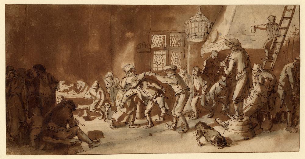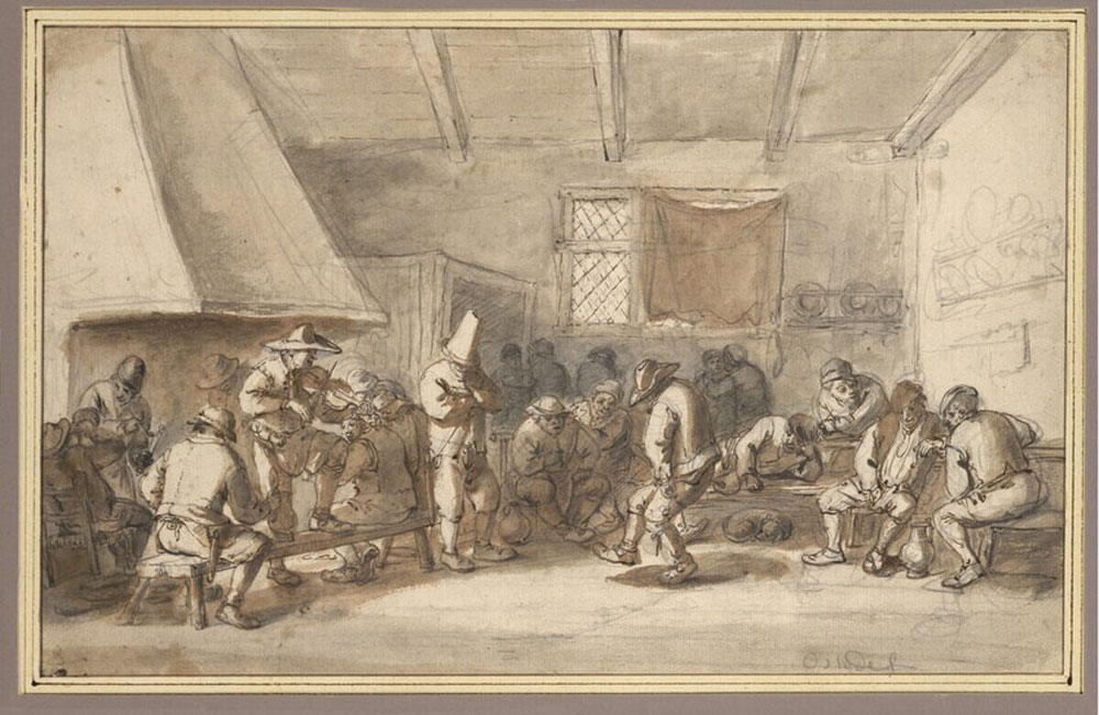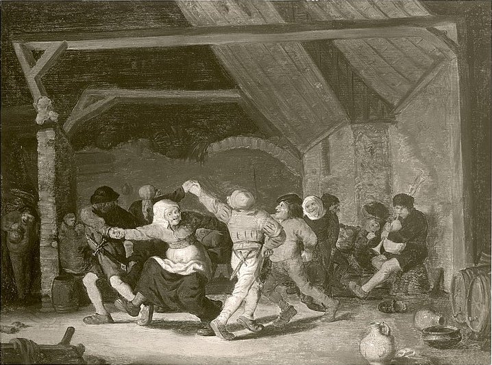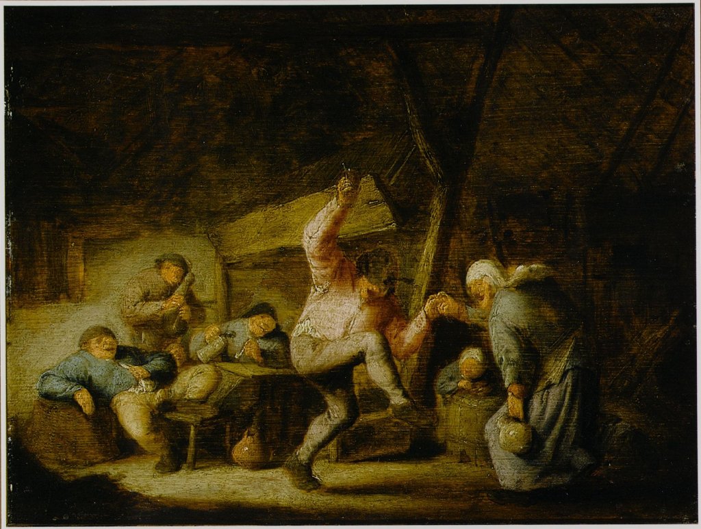 During the 17th century, the city of Haarlem was bustling with activity. In a time of economic hardship and religious persecution, protestant Haarlem attracted many Flemish citizens. The Antwerp-born Frans Hals (1580-1666) arrived in Haarlem as an infant, trained as a painter, ultimately settling there permanently. Hals established himself as Haarlem’s most prominent artist and ran his own workshop. Artists, especially those from the Southern Netherlands, were drawn to the northern city. The Flemish painter Adriaen Brouwer (1605-1638), master of the low-life genre, worked in Haarlem until 1631. Possibly he studied with Frans Hals. Adriaen van Ostade (1610–1685), born in the Southern Netherlands, spent his entire life in Haarlem. He was primarily a painter and etcher of peasant genre scenes. Isaac van Ostade (1621–1649), younger brother of Adriaen, was born in Haarlem. He was well-known for his genre and landscape paintings. Brouwer and the Van Ostade brothers painted peasants drinking, frolicking, flirting, smoking, fighting, revelling, making music, and dancing. All three portrayed dancing peasants with an unparalleled zest for movement.