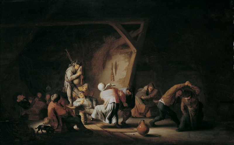 The scene is a downtrodden tavern: liquor is in abundance and rustics smoke. Elsewhere, peasants play card games, lounge, and in the right-hand corner, a man is relieving himself. A musician standing on an upturned tub plays the flageolet. A group of revellers perform a simple, improvised dance spurred on by a lad standing on a ladder. The dancing figures are painted in a ‘traditional’ low-life style, marked by stooped carriage, bent knees, and crude shapes. A cumbersome appearance and graceless lower legs complete the picture. The dancers, in contrast with the surrounding peasants, are animated. The leading couple extends their arms to create an arch for the other dancers to pass under, as is traditional in many folk dances. The first man to pass under the arch twists, bends, and protrudes his hip forcefully to the side. He also seizes the opportunity to grab the peasant woman’s backside. Right behind him another dancing couple scurries friskily towards the arches.