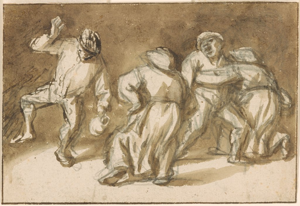 How graphic can a drawing be? In this miniature, monochrome drawing, Isaac van Ostade captures the fun, the vivaciousness, and the boisterous movement of two very jolly couples. He draws lines of various thicknesses to represent the figures’ contours, highlighting the limbs with a darker, more expansive stroke. Quite remarkable is the sense of velocity conveyed by the markings on the women’s skirts. The dancers are hefty, rounded, and move in an uncouth manner. But look at the way they move! The woman on the right grasps her partner tightly. She appears to swing around with all her might. And the front couple capers from one leg to the next, rocking exuberantly from side to side. The foursome is obviously having a great time. The sprightly male peasant carries a jug. Undoubtedly, a little ale does wonders for dance skills.