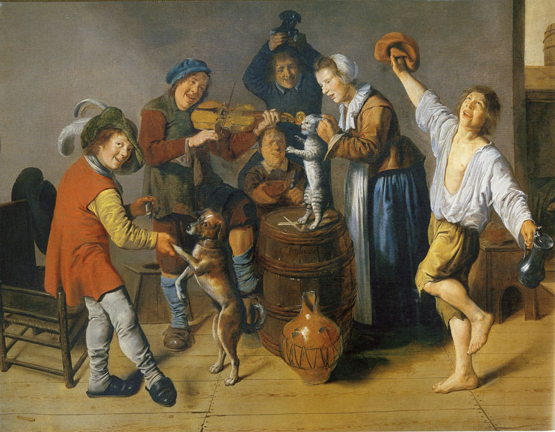 How do you teach a cat to dance? Jan Miense Molenaer apparently had some idea; merely pull on the cat’s ears until it stands on its hind legs. Merry Company playing Music and Dancing in an Interior, created in the 1630s, shows youngsters cruelly abusing a cat. The unfortunate cat is lifted mercilessly upwards and forced to dance, to the hilarity of the surrounding children. Regardless of the wretched animal’s squealing and visible display of anguish, the youngsters continue their merriment. The dog looks much more at ease, dancing willingly with one of the lads. The dog enjoys the children’s attention and is quite happy to comply. The cat, in contrast, has no intention of performing any involuntary action.
