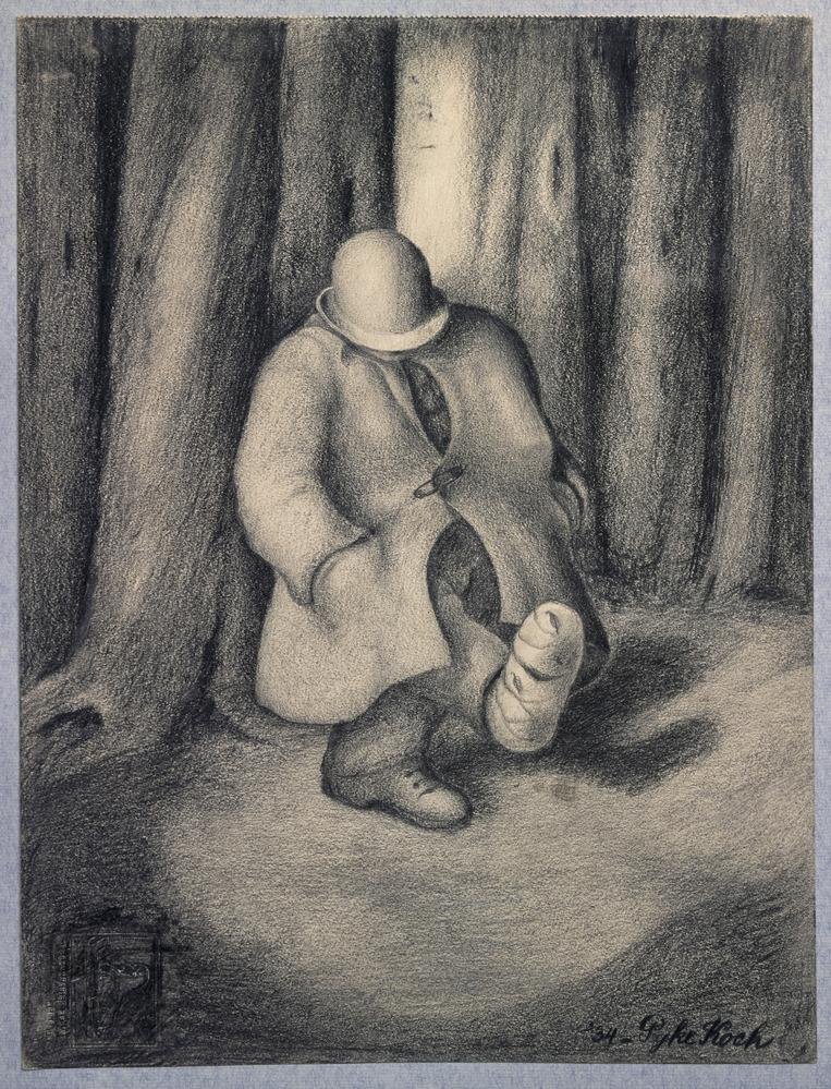 And finally, the promised image of an inebriated dancing figure. I saw this small drawing at an extraordinary exhibition dedicated to Pyke Koch. I was amazed at the delicacy of this meticulous drawing. Koch is an autodidact. He is famed for his magical realist works. His paintings are austere, featuring realistic characters finding themselves in bizarre and puzzling surroundings. The Dancing Drunk (1934) is an early work highlighting an unremarkable, anonymous figure, clad in a sloppy coat, donning a bowler hat that entirely obscures the face; a group of tall tree trunks clustered closely together are the sole companions.